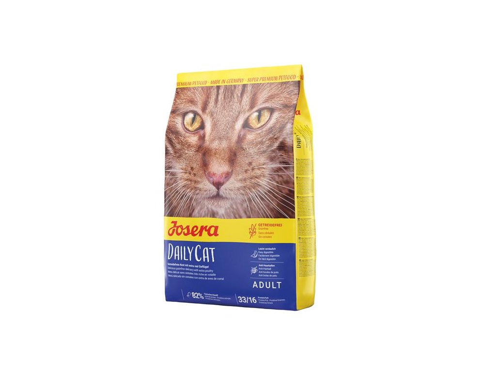 Josera DailyCat je vhodné krmivo pre indoor a outdoor mačky, ktoré sú citlivé na obilie a preferujú chutnú hydinu.